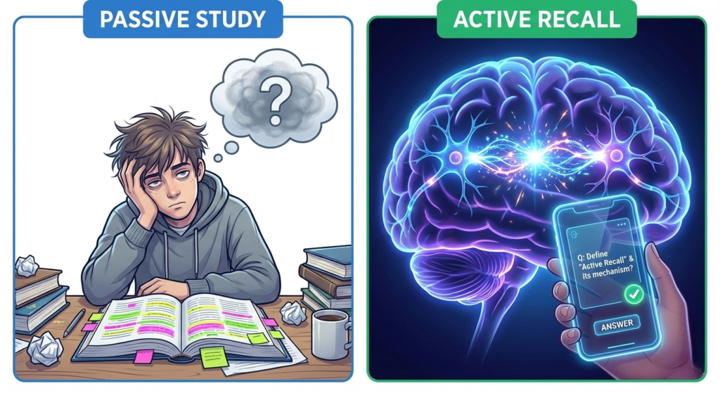 Active Recall is the opposite. It is the act of forcing your brain to retrieve information without looking at the answer.